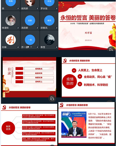 按照上级党组织的要求和部署,6月22日上午9:30分,思政部直属党支部组织全体教师党员开展“千堂党课进支部”之“永恒的誓言 美丽的答卷”疫情防控专题微党课活动。本次微党课由公司宣传部部长刘祥富同志主讲,他主要从疫情危机、战役时间、制度优势、迎难而上四个方面给大家讲解疫情发生以来,党中央的决策部署、公司的防疫举措,重点讲解了习近平总书记关于疫情防控系列重要讲话精神和指示精神。在这场疫情防控中,中国共产党坚持做到“人民至上、生命至上,全员动员、同心战’疫’,利用技术、科学防控”,充分体现中国特色社会主义制度优势;发出“不惜一切代价”、“全力救治”“构建人类命运共同体”等永恒誓言,并用实际行动向中国人民乃至全世界人民交出了一份美丽的答卷。