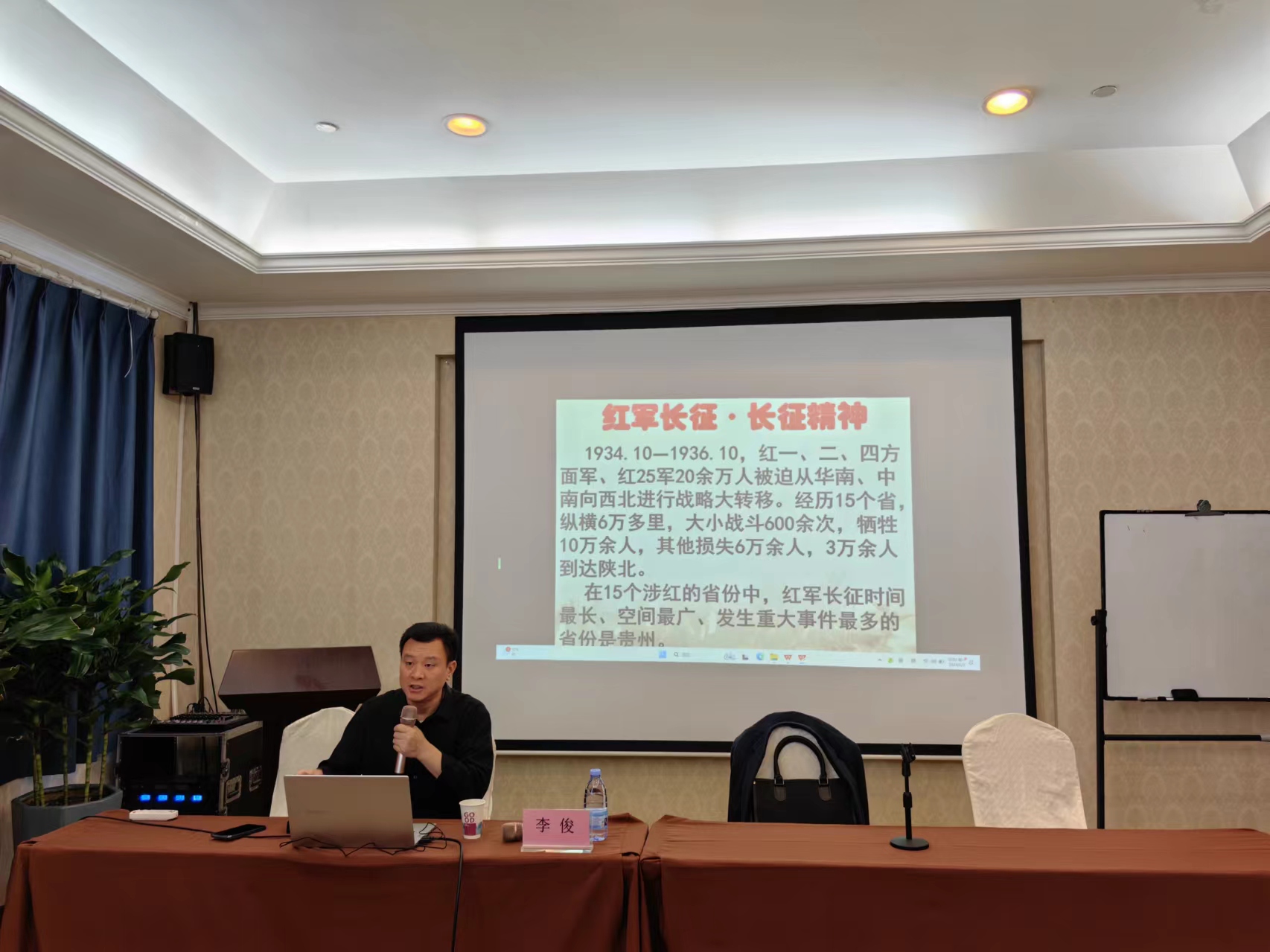 随后,著名长征史研究专家,贵州师范大学文学教育与文化传播研究中心主任、文公司副经理李俊为老师们作《红军长征在贵州》专题学术讲座。他以红军长征中的重大历史事件为主线,生动细致地讲述了红军长征的艰辛历程以及由此谱写的伟大长征精神,使老师们对长征过程有了直观清晰地认识,为接下来的现场教学和实践研修奠定了理论基础。