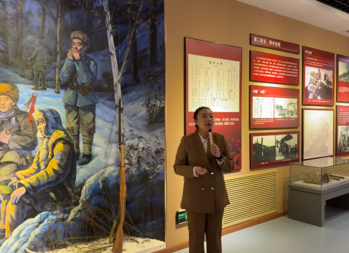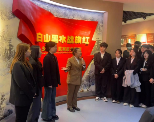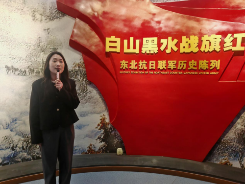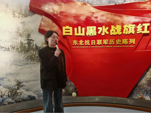 课程伊始,尹迪老师化身展馆讲解员,带领同学们穿梭在陈列着珍贵历史文物、泛黄文献资料及生动历史图片的展厅中。从锈迹斑斑的武器装备到字迹模糊的作战笔记,尹迪老师用细腻生动的语言,将抗联战士们英勇无畏、艰苦卓绝的斗争故事娓娓道来,使在场学员的思绪拉回到那段烽火连天的岁月。